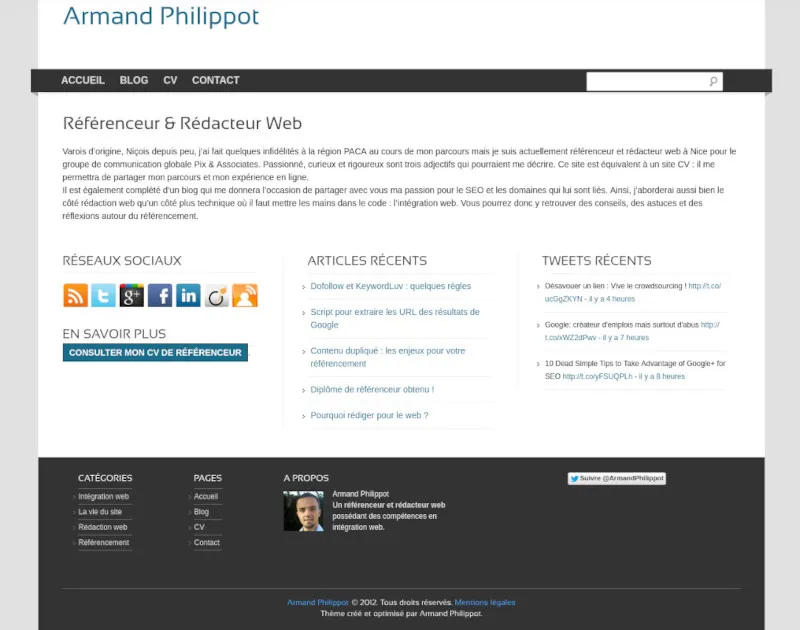 I didn’t want to maintain two different domain names anymore, so I closed my old blog and I integrated a blog section into ArmandPhilippot.com. This time, I went with a homemade WordPress theme. The contents of the site were always “professional” oriented, being exclusively oriented towards the web: writing, integration and SEO.