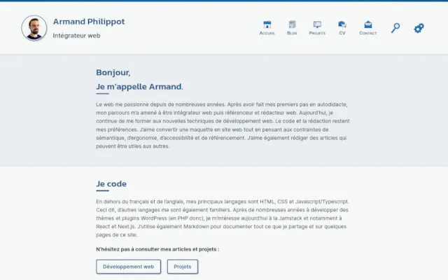 Projets Total :4 projets S’abonner Type de projet :Site web Armand.Philippot.Eu Découvrez comment ce site est construit. Type de projet :Appli Dotig Un gestionnaire de dotfiles. Type de projet :Thème Coldark Deux thèmes (clair et sombre) dans les tons bleu-gris. Type de projet :Site web ArmandPhilippot.com Mon précédent site web.